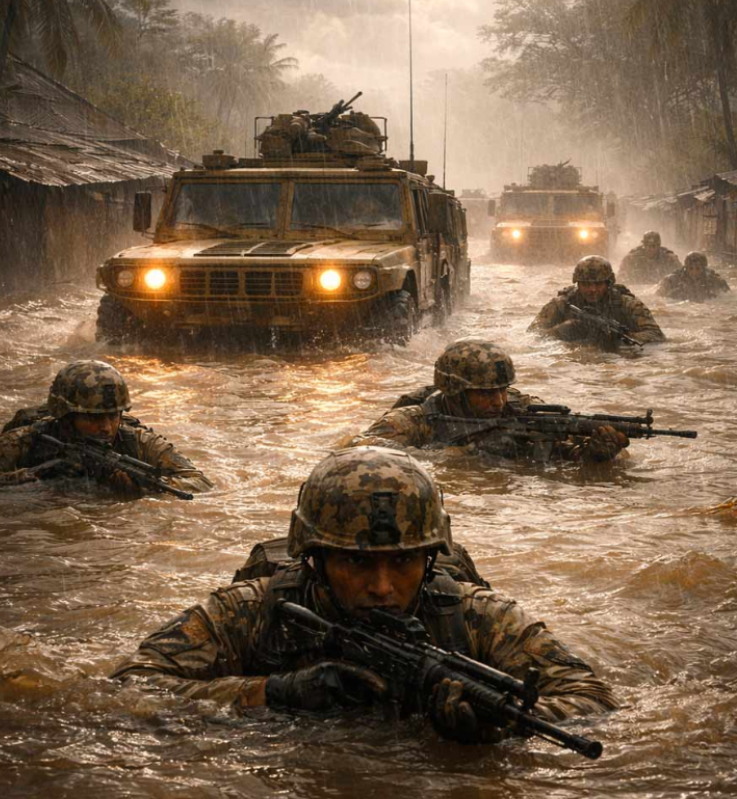 Aku melihat banyak kendaraan militer melaju menembus genangan air yang tinggi, sementara para prajurit berjalan menerobos air hingga setinggi mata mereka, bergerak menjelajahi seluruh negeri tanpa berhenti, sekalipun menghadapi berbagai kesulitan.